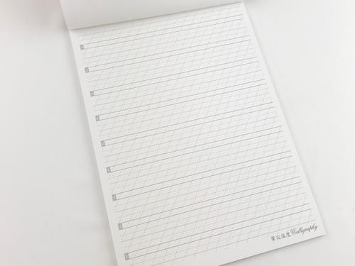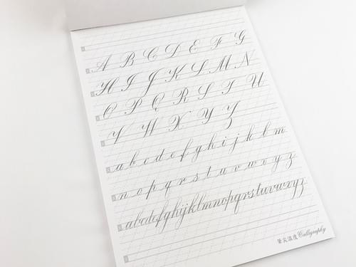 頁數 : 50頁,第一頁有26個英文字母大小寫範例,剩下的頁面只有銅版體練習用格線(X-high 5mm,比例 2:1:2,字體斜度 55度)。