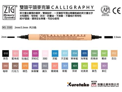 英文書法書寫的筆款,雙頭2mm及3.5mm筆寬設計,一支筆即可寫出兩種粗細的英文書法字。
